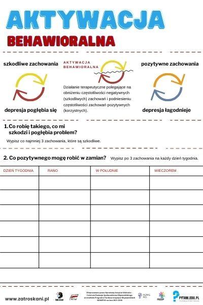 Pomóc w tym może na przykład podjęcie tygodniowego wyzwania (najlepiej w motywującej się wzajemnie grupie) aktywacji behawioralnej. Polega to na tym, by zaplanować, według załączonego schematu zajęcia na cały tydzień a każdego wieczora rozmawiać z innymi osobami w grupie, na ile udało się plany zrealizować. Warto jakieś działania zaplanować wspólnie.